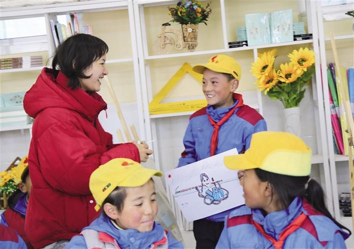 美術(shù)教室布置之初,從一年級到六年級,二三十名學(xué)生追到新教室,拿著彩筆在墻上畫出一幅幅稚嫩卻充滿童趣的圖畫。“我想畫一個城堡,給它圖上美麗的顏色!”“我要把牦牛畫在墻上?!薄拔乙媯€飛行員”……