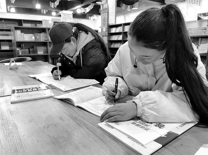 圖為西藏拉薩市第四高級中學(xué)的高三生強巴曲珍和白瑪在寒假期間來到圖書館做測試題,備戰(zhàn)今年6月的高考。記者 索朗瓊珠 攝