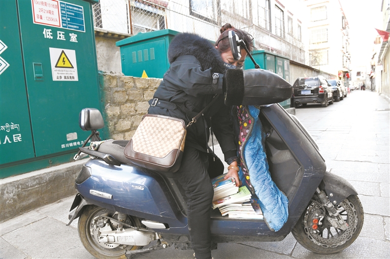 圖為城關區(qū)第二小學三年級(11)班班主任旦增色珍騎著電動車把分類分揀好的教材送到學生家中。