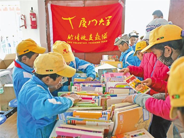 圖為廈門大學(xué)竹蜻蜓支教隊(duì)在當(dāng)雄縣龍仁鄉(xiāng)中心小學(xué)舉辦流動(dòng)圖書館活動(dòng)。通訊員 黃宇霞 高捷 何春雨 崔慶煒
