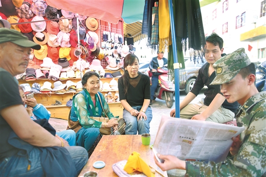 圖為拉薩警備區(qū)某團(tuán)官兵為社區(qū)居民宣講政策。通訊員 涂君陽(yáng)攝