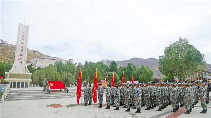 圖為駐藏某汽車團(tuán)野外駐訓(xùn)分隊(duì)在江孜宗山英雄紀(jì)念碑前開展主題黨課活動(dòng)。加央群決 李豪 攝