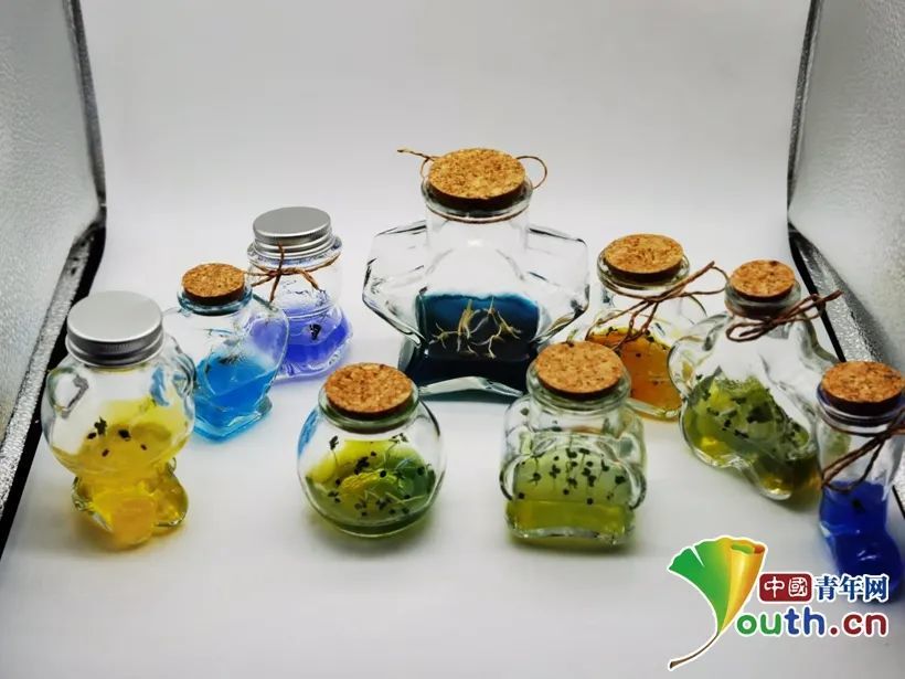在形態(tài)各異的玻璃罐里,裝著色彩斑斕的培養(yǎng)基,上面孕育著排列工整的幼苗,十分精致。記者了解到,這些看似相同的植物苗,實(shí)際上包含了油菜、小麥以及大豆三個(gè)不同品種,更是此專(zhuān)業(yè)老師的研究成果。其中,油菜品種是該專(zhuān)業(yè)老師郭世星用于景觀美化的育成品種紫葉油菜,小麥?zhǔn)菍?zhuān)業(yè)負(fù)責(zé)人蒲至恩新育成的紫色和藍(lán)色品種,大豆是該專(zhuān)業(yè)老師武曉玲的育成品種,具有耐蔭特點(diǎn)?!拔覀兿胨徒o新生一份有意義的見(jiàn)面禮,增加大家對(duì)這個(gè)專(zhuān)業(yè)的歸屬感。”蒲至恩說(shuō)。