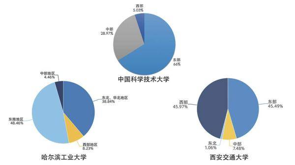 圖3.中國(guó)科大、哈工大、西安交大2019屆畢業(yè)生就業(yè)地區(qū)分布