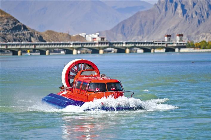 啟動(dòng)儀式現(xiàn)場(chǎng)的水陸兩棲氣墊船。
