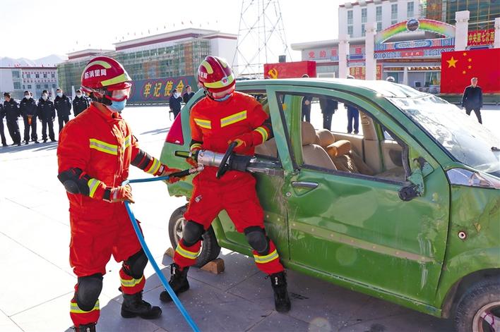 阿里地區(qū)消防員在演示汽車破拆救援。圖片由西藏自治區(qū)消防救援總隊提供