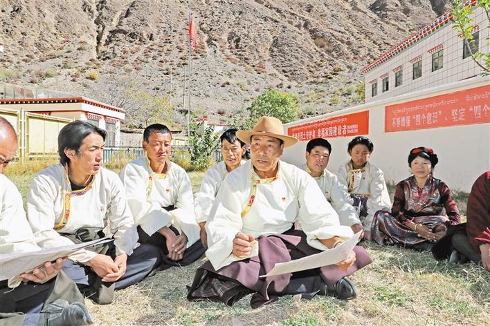 圖為昌都市芒康縣如美鎮(zhèn)竹卡村村“兩委”班子成員和駐村工作隊向村民宣講黨的十九屆五中全會精神。洛桑 唐斌 攝