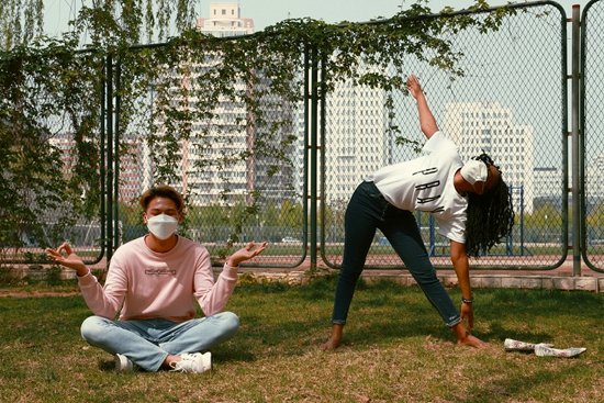 2020年4月14日,北京,對外經(jīng)濟貿(mào)易大學的來華留學生在戶外鍛煉。李享/攝