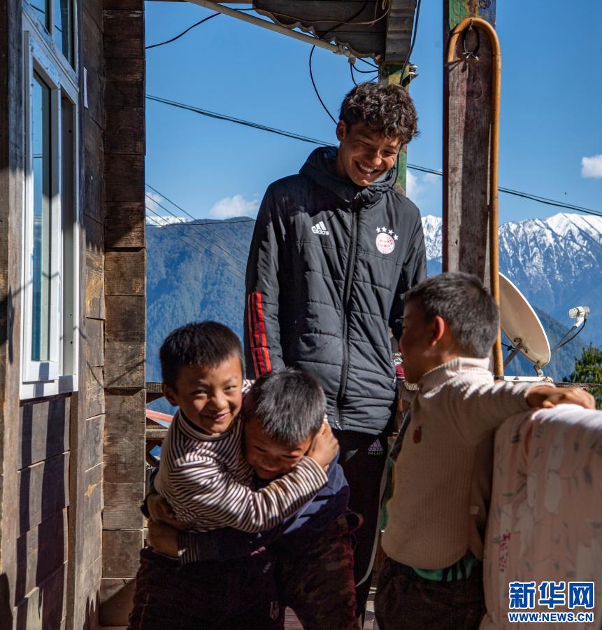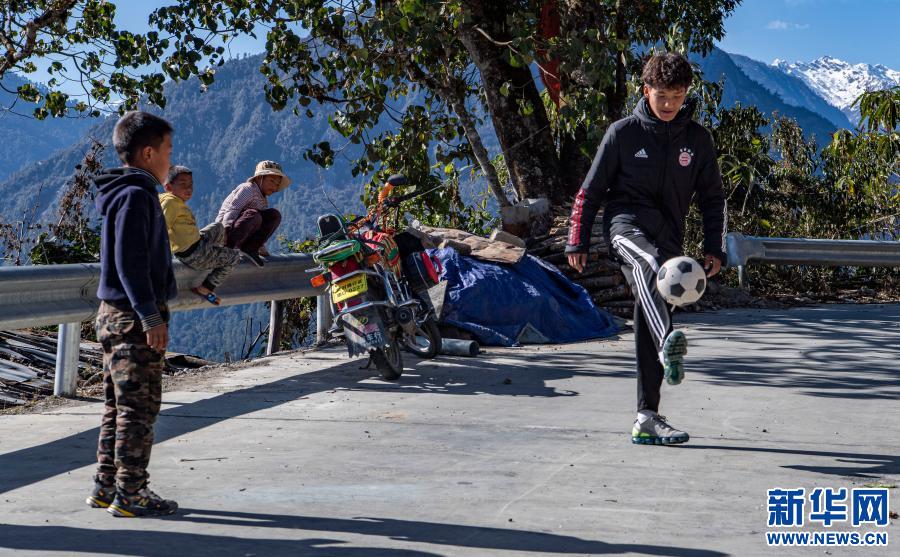 在西藏林芝市墨脫縣德興鄉(xiāng)巴登則村,旺前羅布向弟弟們展示自己的球技(2月9日攝)。新華社記者 孫非 攝