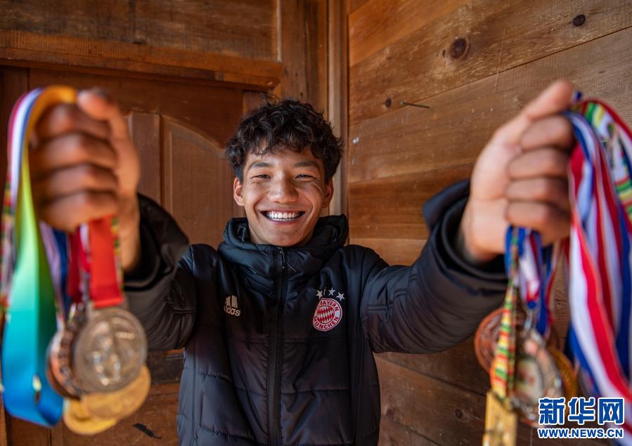在位于西藏林芝市墨脫縣德興鄉(xiāng)巴登則村的家中,旺前羅布展示自己獲得的獎牌(2月9日攝)。新華社記者 孫非 攝
