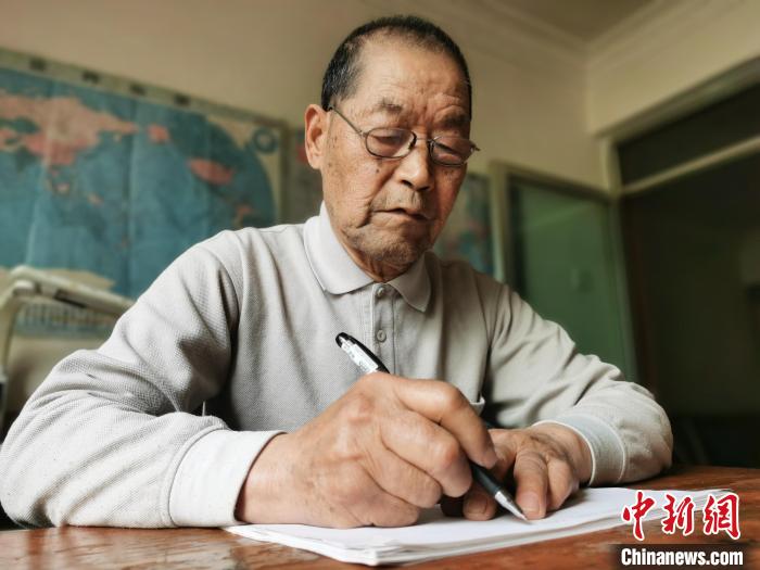 圖為在青海西寧頤養(yǎng)天年的朱汝完向記者展示氣象發(fā)報基本功?!?zhí)砀?攝