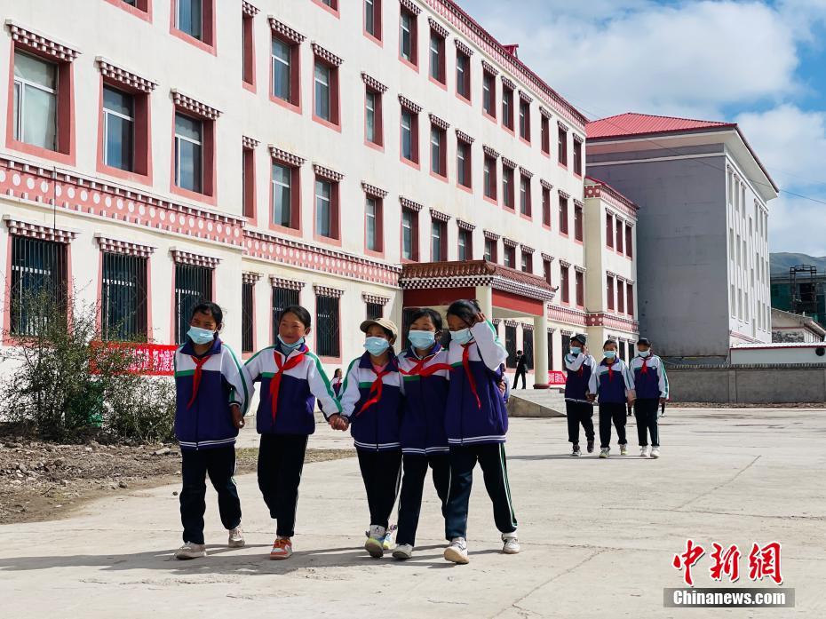 9月1日,青海省果洛藏族自治州瑪多縣地震災后過渡安置一校區(qū)的同學們迎來了新學期。圖為學生們下課后走出教學樓。為確保青海瑪多全縣中小學(幼兒園)學生秋季正常開學,該縣對災區(qū)2933名學生、322名教職工分批次過渡安置到青海省果洛全州各校以及青海省三江源民族中學就學。 中新社記者 孫睿 攝