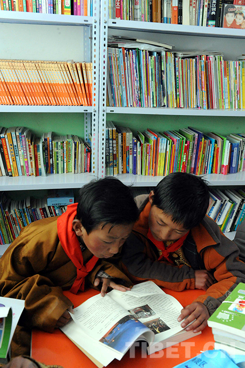 這是西藏那曲地區(qū)那曲縣(現(xiàn)那曲市色尼區(qū))羅瑪鎮(zhèn)中心小學(xué)學(xué)生在新建的“愛心書屋”讀書(唐召明2014年5月29日攝)