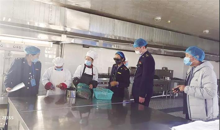 拉薩市市場(chǎng)監(jiān)管局執(zhí)法人員檢查學(xué)校后廚衛(wèi)生。圖由 拉薩市市場(chǎng)監(jiān)管局 提供