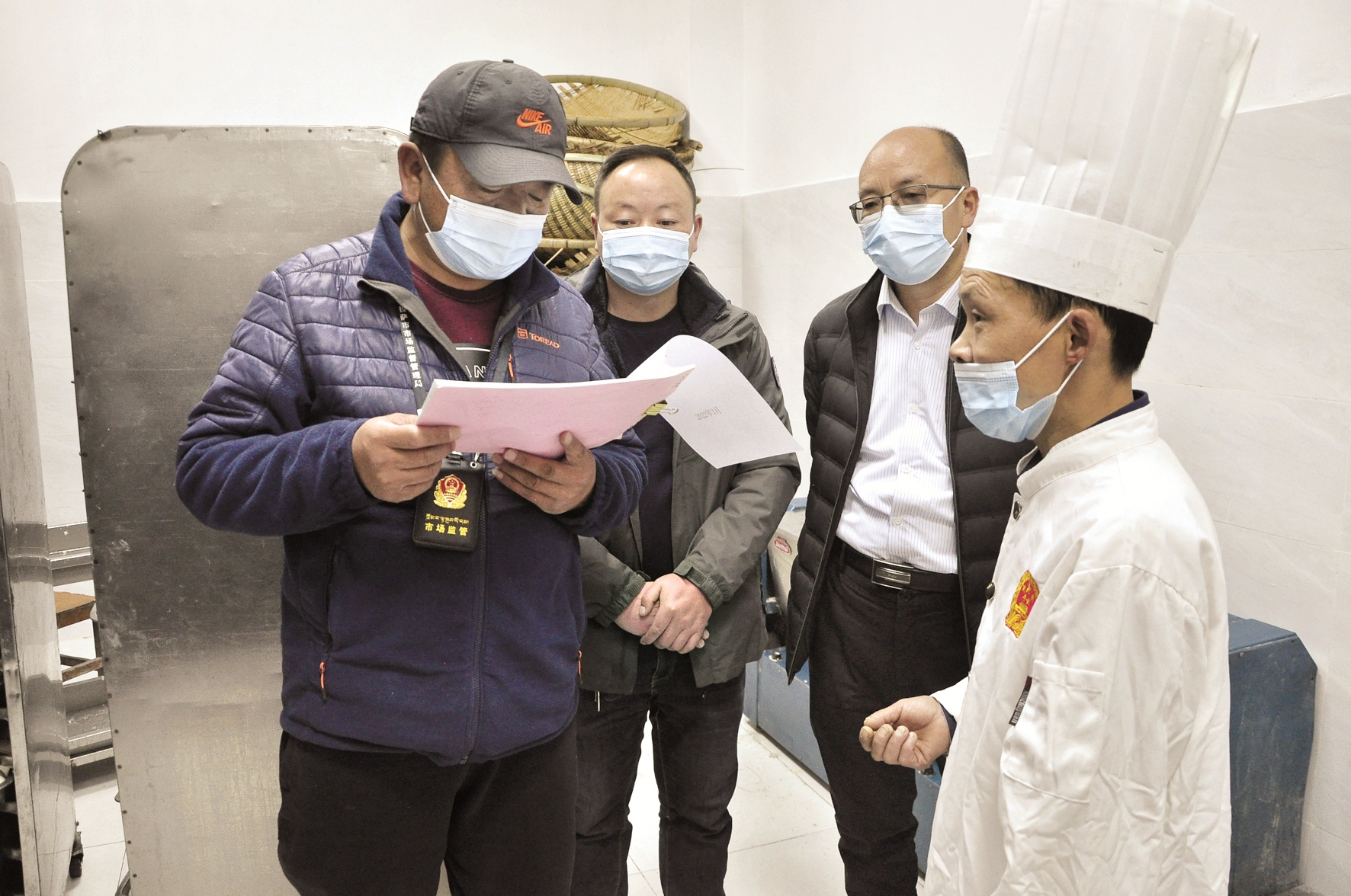 圖為市市場(chǎng)監(jiān)督管理局執(zhí)法人員在對(duì)學(xué)校食堂后廚進(jìn)行檢查。拉薩融媒記者 趙耀鐵攝