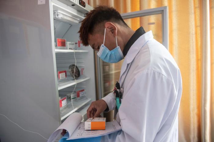 米瑪次仁在林芝市巴宜區(qū)更章鄉(xiāng)衛(wèi)生院清點(diǎn)疫苗庫(kù)存情況(2021年12月24日攝)。新華社記者 孫瑞博 攝