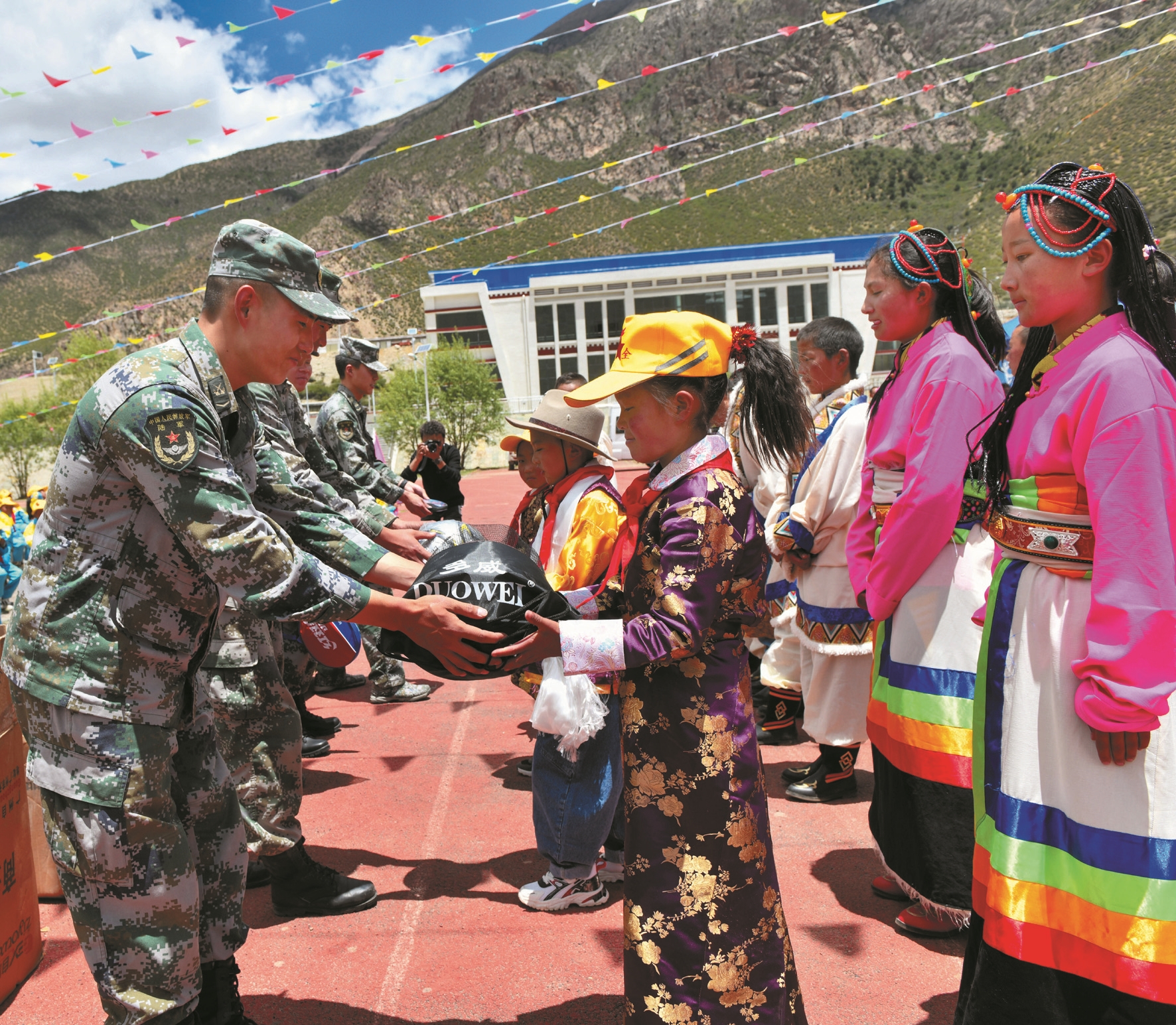 圖為活動現(xiàn)場,西藏軍區(qū)某部戰(zhàn)士向阿朗鄉(xiāng)中心小學學生捐贈愛心物品。(市委宣傳部駐拉康村工作隊供圖)
