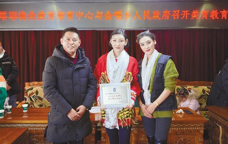 洛桑卓瑪(中)帶領團隊前往日喀則市江孜縣金嘎鄉(xiāng)開展美育公益活動。