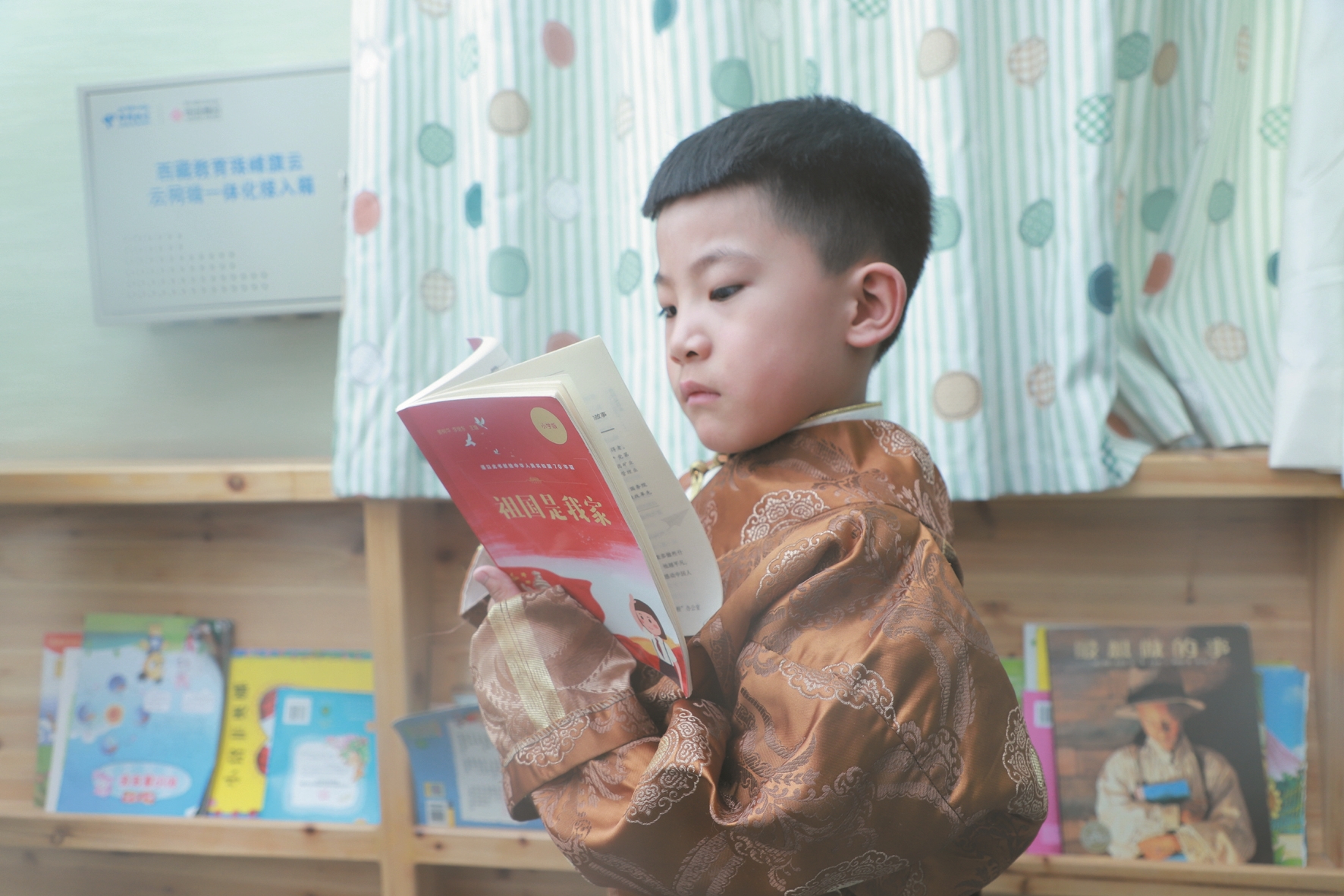 圖書館里,來自拉薩市江蘇實(shí)驗(yàn)幼兒園大五班的小朋友益西加措仔細(xì)地挑選著自己喜歡的書籍,只見他饒有興致地選中這本《祖國(guó)是我家》,并發(fā)現(xiàn)了書中“我在南京,我為中華之崛起而讀書”的卡片時(shí),他回應(yīng)道:“我在西藏,我為中華之崛起而讀書?!?/p>