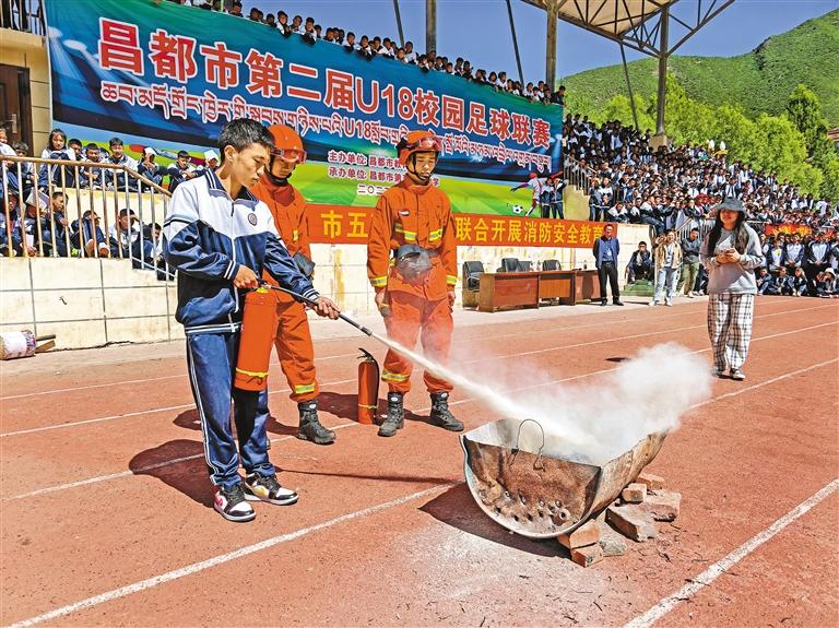 圖為在消防員的指導(dǎo)下,學(xué)生體驗(yàn)滅火。記者 桑鄧旺姆 通訊員 鄧珠平措 攝