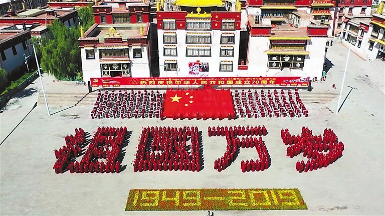 引導(dǎo)宗教界人士爭做愛黨愛國愛人民、堅決維護祖國統(tǒng)一和民族團結(jié)的模范。圖為2019年10月1日,西藏自治區(qū)昌都強巴林寺僧人以自己的方式表達對中華人民共和國成立70周年的祝福。