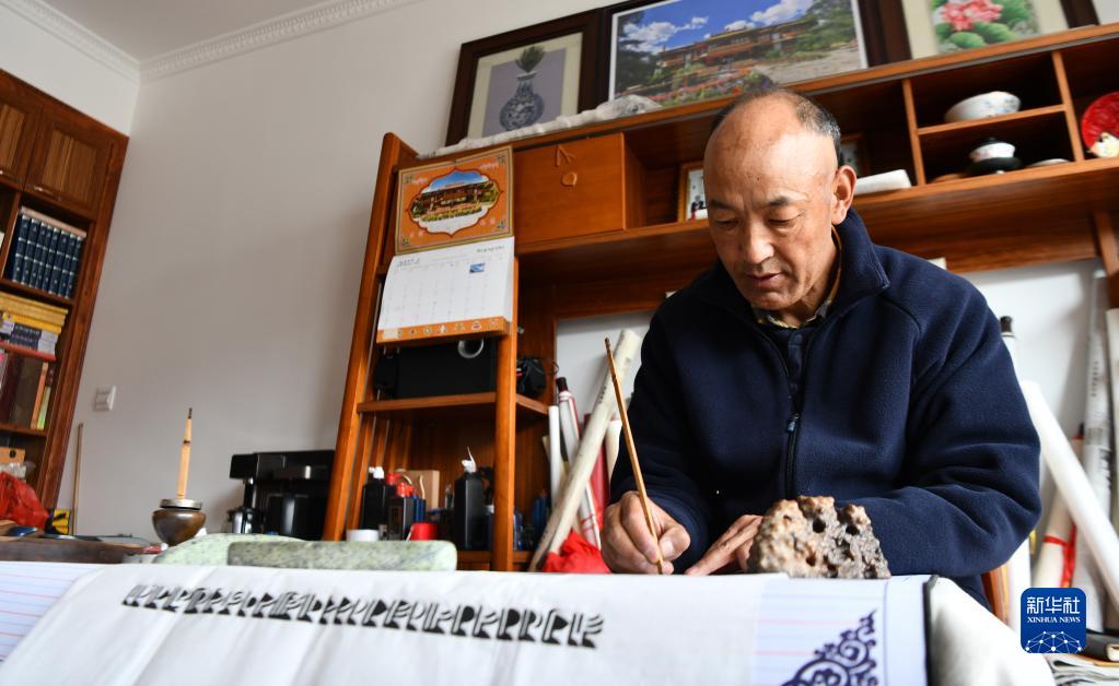 久米次成在家中撰寫(xiě)梵文書(shū)法(4月19日攝)。新華社記者 晉美多吉 攝