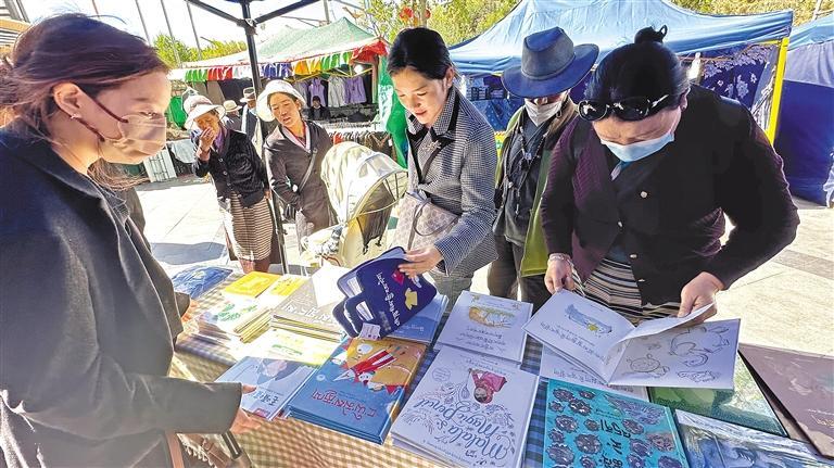 圖為市民群眾在活動(dòng)現(xiàn)場選購青年創(chuàng)業(yè)者文創(chuàng)產(chǎn)品——早教啟蒙讀物。記者 格桑倫珠 攝