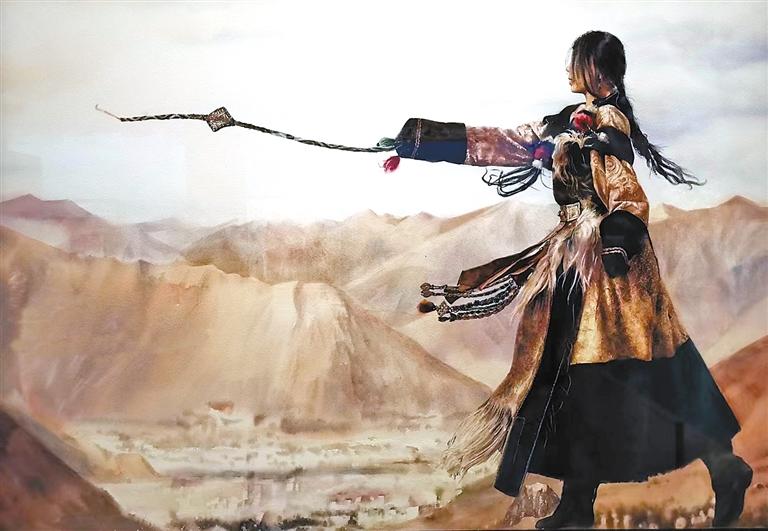 中國畫作品《幸福西藏》運(yùn)用工筆重彩的繪畫藝術(shù)表現(xiàn)形式,描繪了布達(dá)拉宮廣場上民族和睦的美好生活圖景。畫面中,湛藍(lán)天空下,藏族群眾與遠(yuǎn)道而來的各地游客們相聚雪域高原,燦爛的笑容映照出新時代西藏人民的美好生活,也反映出西藏自然風(fēng)光、人文風(fēng)情對各地游客的極大吸引力。從青年旅行者們或騎著單車,或舉起相機(jī)認(rèn)真拍照的表情,能深刻感受到他們對美麗西藏的向往。同時,繪畫作品反映出近年來西藏旅游事業(yè)的蓬勃發(fā)展以及各族兒女團(tuán)結(jié)互助、攜手進(jìn)步的新時代美好生活景象。水彩·粉畫《颯·薩》運(yùn)用人物特寫的藝術(shù)創(chuàng)作手法,展現(xiàn)出一位西藏姑娘甩出烏爾朵的颯爽姿態(tài);油畫《藏歷新年薩迦禳祈?!芬悦骺鞜崃业纳屎嫱谐霎?dāng)?shù)孛癖娺M(jìn)行藏歷新年祈?;顒拥臍g樂場景;油畫《中國玉麥》以紀(jì)實(shí)敘事的創(chuàng)作方式,描繪了隆子縣玉麥鄉(xiāng)卓嘎、央宗姐妹放牧守邊的故事,畫面中她們專注地懸掛國旗的樸實(shí)舉動,傳遞出高原姊妹對祖國的深愛之情。