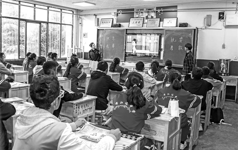 工布江達縣公安局禁毒大隊民警與拉薩市職業(yè)技術(shù)學(xué)院志愿者在縣中學(xué)向?qū)W生播放禁毒宣傳片。記者 彭琦 實習(xí)生 旦增旺姆 攝