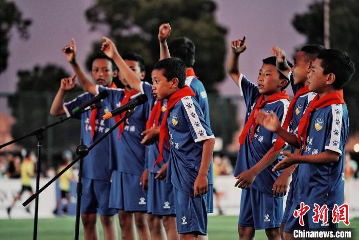 圖為足球小將們賽場上合唱藏語歌曲《FLY》。曲麻萊縣委宣傳部供圖
