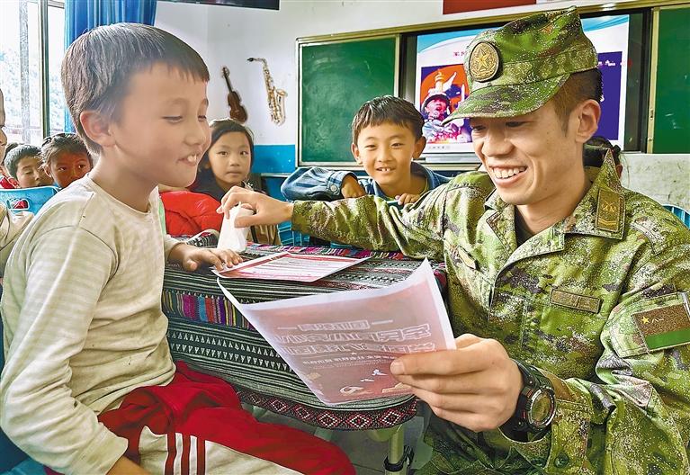 圖為在林芝市墨脫縣格當(dāng)鄉(xiāng),駐地官兵為小學(xué)生普及國(guó)防知識(shí)。郎玲 記者 王敏 攝