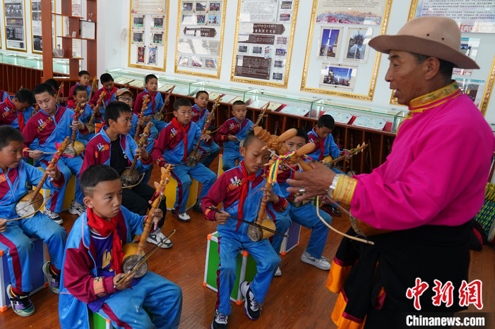 待弦子興趣班30多名學(xué)生坐下,定主如往常一樣,首先帶領(lǐng)學(xué)生們校準(zhǔn)弦子的高低音,接著才是傳授新曲子。他要求學(xué)生不僅會拉奏樂曲旋律,還要能吟唱歌詞,“地處高高的雪山,菩提樹兒把根扎,賓客是花白牦牛,菩提樹兒長得高,牦牛呀膘肥體壯,菩提樹兒葉茂盛……”