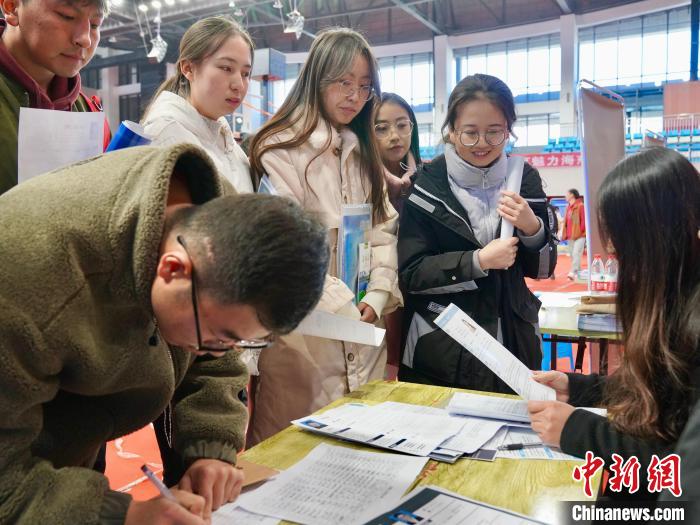 圖為招聘會(huì)現(xiàn)場,畢業(yè)生正在填寫信息?!⒀?攝