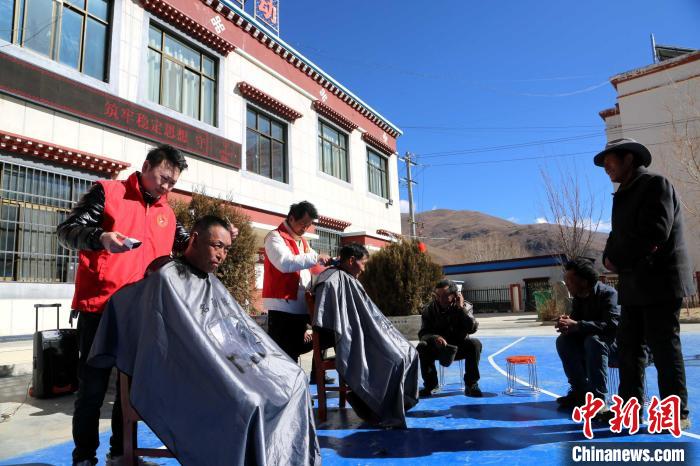 圖為理發(fā)店店長(zhǎng)劉陽(左一)為民眾提供免費(fèi)理發(fā)服務(wù)。倫珠澤仁攝