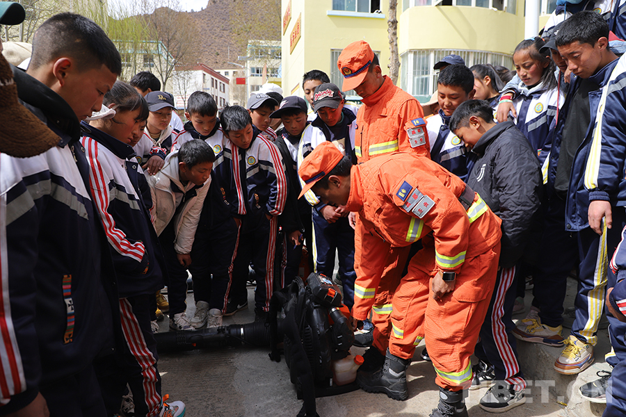 “這是風力滅火機,此款型號的風力滅火機最高風速最高可以達到90m/s,遇見草原火時,我們就用它來進行滅火。”消防員背起風力滅火機,將裝備點火后對準預設物進行示范操作。在現(xiàn)場互動中,部分師生代表當起“消防員”體驗設備操作。除了現(xiàn)場互動環(huán)節(jié),左貢縣消防人員還仔細檢查了學校的消防設施配置,并指導學校如何定期進行消防自檢。