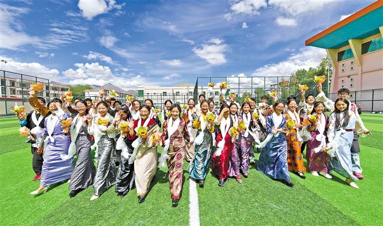 6月4日下午,拉薩中學(xué)的高三學(xué)生們?cè)谛@內(nèi)盛裝慶祝畢業(yè)。記者 唐斌 攝