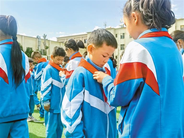 圖為少先隊(duì)員代表為新隊(duì)員佩戴紅領(lǐng)巾。記者 次仁平措 通訊員 胡舟 攝