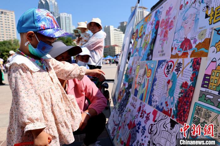 圖為小朋友和家長觀看禁毒知識(shí)手繪。薛蒂 攝