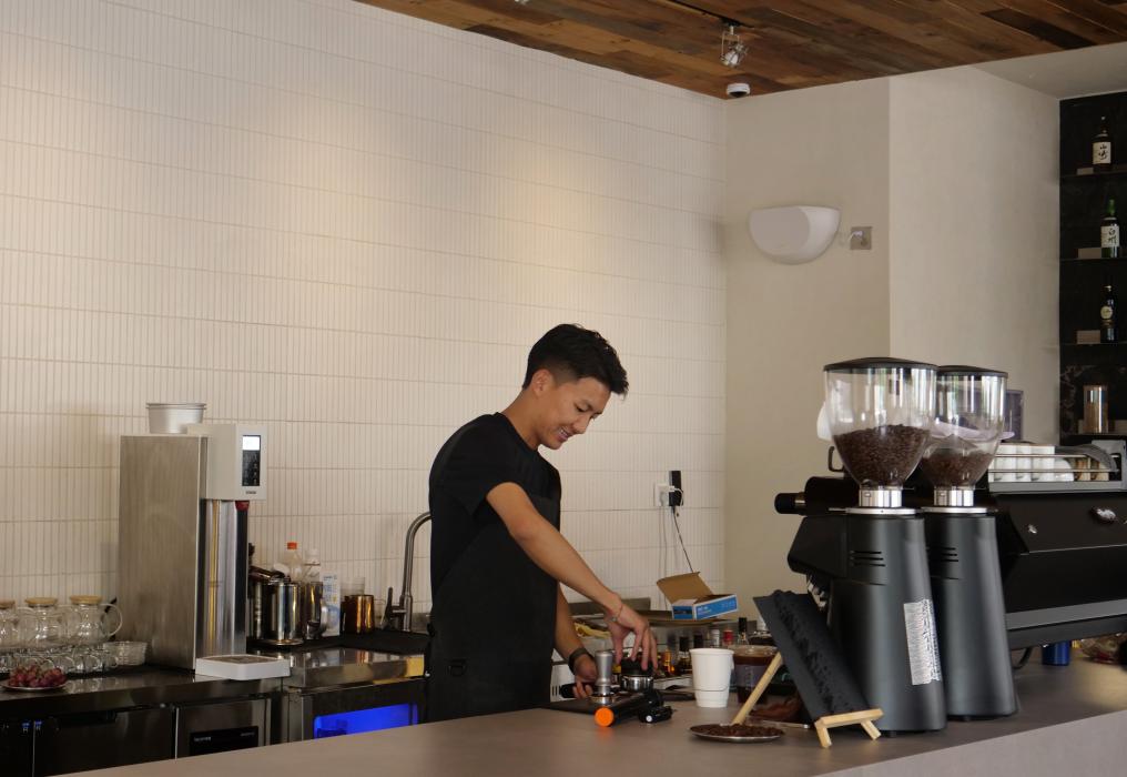 拉巴旦增在店內(nèi)制作咖啡。(卓瑪 攝)
