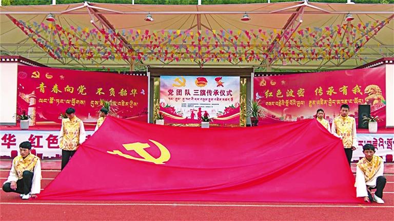 黨團(tuán)隊(duì)三旗傳承儀式現(xiàn)場(chǎng)。記者 胡文 通訊員 旦珍 攝