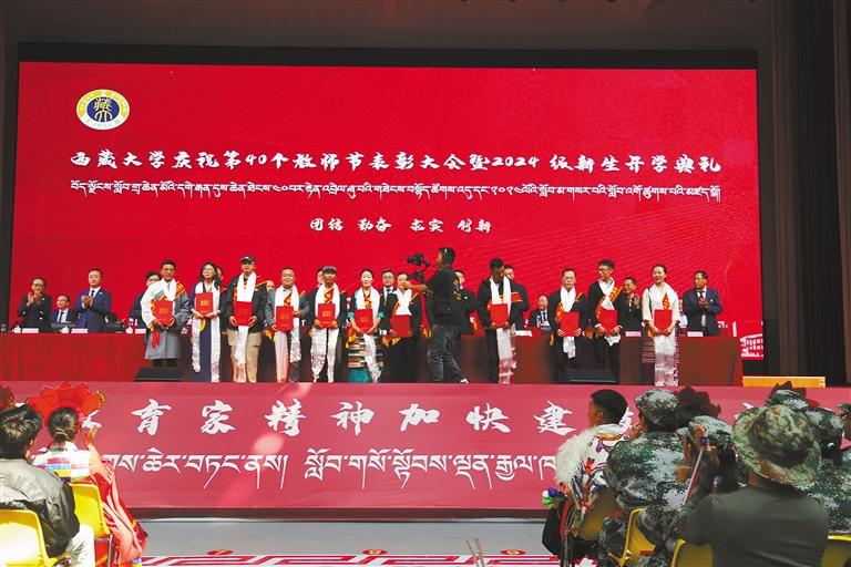 10日下午,西藏大學(xué)在納金校區(qū)雙創(chuàng)活動中心舉辦第40個教師節(jié)表彰大會暨2024級新生開學(xué)典禮?;顒釉跓崆闅g快的暖場歌舞中拉開帷幕,會場內(nèi)紅旗飄揚,氣氛熱烈而莊重,全體2024級新生、學(xué)校各單位主要負責(zé)人、受表彰師生代表等共計3300余師生齊聚一堂,共同見證這一重要時刻。