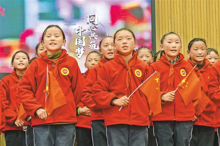 圖為3月5日,來自受災(zāi)最嚴重的定日縣長所鄉(xiāng)、措果鄉(xiāng)、曲洛鄉(xiāng)的3所小學的學生在開學典禮上演唱歌曲《同心共筑中國夢》。新華社記者 姜帆 攝