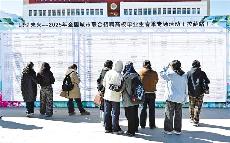 近日,由拉薩市人力資源和社會保障局主辦,西藏大學(xué)、西藏民族大學(xué)協(xié)辦的2025年全國城市聯(lián)合招聘高校畢業(yè)生春季專場活動在西藏大學(xué)納金校區(qū)舉行。招聘會提供了文秘、出納、會計、醫(yī)輔、客服等1650個崗位,吸引了不少學(xué)生前來應(yīng)聘。