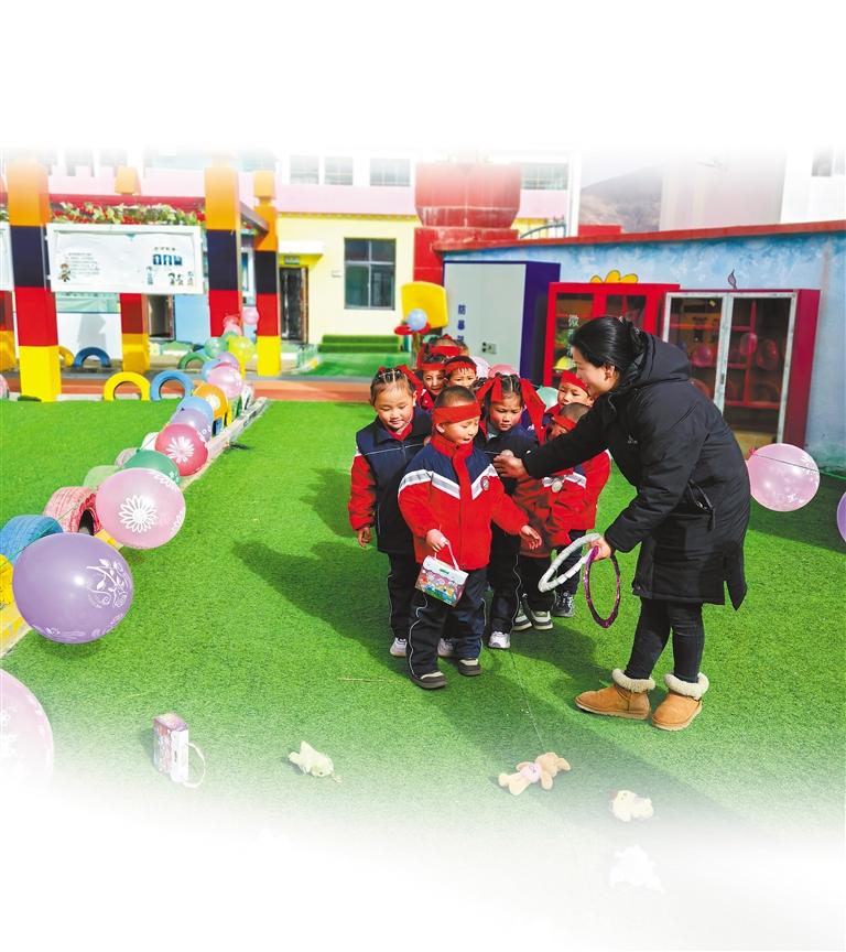 新學(xué)期開學(xué)當(dāng)日,林周縣幼兒園老師組織幼兒做游戲。文/圖 記者 央金