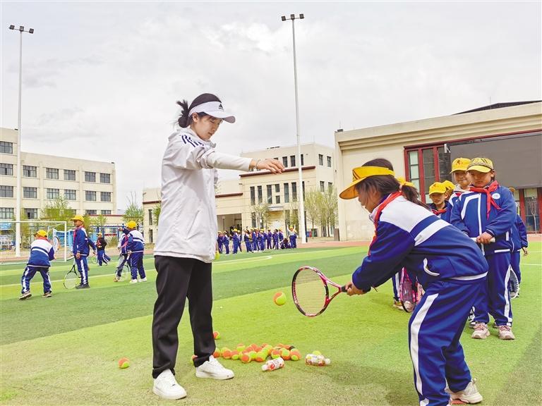 活動(dòng)現(xiàn)場(chǎng),自治區(qū)網(wǎng)球協(xié)會(huì)派出專業(yè)教練團(tuán)隊(duì),介紹了網(wǎng)球的起源、規(guī)則及基本動(dòng)作,并進(jìn)行現(xiàn)場(chǎng)示范指導(dǎo)。在實(shí)際操作環(huán)節(jié),教練從握拍姿勢(shì)、揮拍動(dòng)作和發(fā)球技巧等對(duì)學(xué)生進(jìn)行了細(xì)致示范和耐心指導(dǎo)。