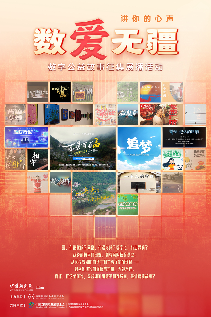 2024年11月起,中國(guó)網(wǎng)絡(luò)社會(huì)組織聯(lián)合會(huì)攜手中國(guó)互聯(lián)網(wǎng)發(fā)展基金會(huì)、中國(guó)新聞網(wǎng),由中國(guó)互聯(lián)網(wǎng)發(fā)展基金會(huì)中國(guó)正能量網(wǎng)絡(luò)傳播專(zhuān)項(xiàng)基金資助支持,組織開(kāi)展“數(shù)愛(ài)無(wú)疆”數(shù)字公益故事征集展播活動(dòng),最終遴選出50個(gè)具有代表性的數(shù)字公益故事。