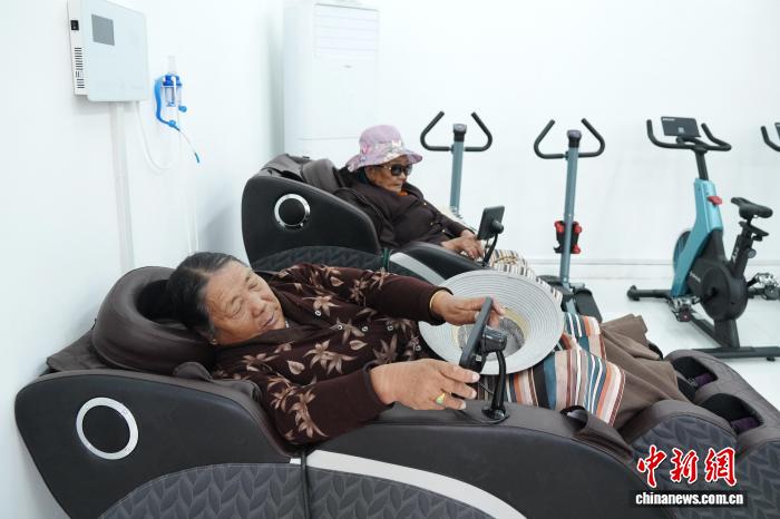 在活動(dòng)室,78歲的白瑪躺在按摩椅中享受按摩服務(wù)。她告訴記者,兒子平日在外上班,她的一日三餐都在驛站。娛樂休閑之余,她對(duì)按摩椅很感興趣,每天都用1個(gè)小時(shí)疏通筋骨。和記者交流時(shí)一次按摩結(jié)束,白瑪熟練地在操作屏上再次按下啟動(dòng)按鈕。