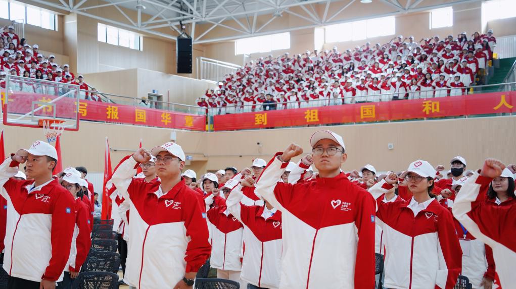 7月29日,2025年大學(xué)生志愿服務(wù)西部計(jì)劃服務(wù)西藏專項(xiàng)志愿者出征儀式上,志愿者們正在宣誓。 陳梟 攝