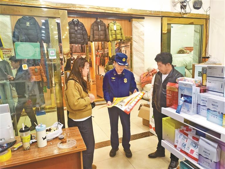拉薩市消防救援支隊宣傳員為商貿(mào)市場商鋪店主強調(diào)消防安全。