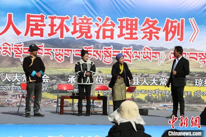 圖為瓊結縣藝術團正在表演關于人居環(huán)境治理方面的小品。次旦卓嘎 攝